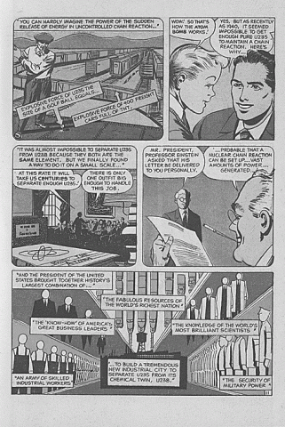A page from the "comic book" history of atomic power, created by General Electric at the request of the Atomic Energy Commission, references the 1939 letter which Albert Einstein sent to President Roosevelt.