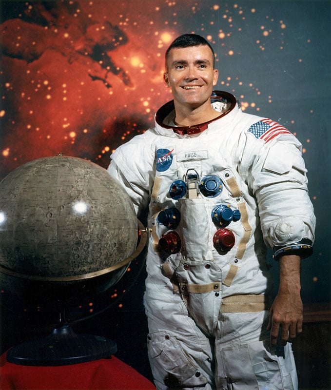 Image of a photograph of astronaut, Fred Wallace Haise. He was a member of the Apollo 13 crew which encountered near-fatal difficulties while in space.